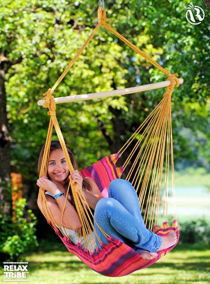 La silla hamaca colgante, suavemente acolchada y decorada con una combinación de rayas en colores vivos y cálidos. Lista para los sueños de verano…
