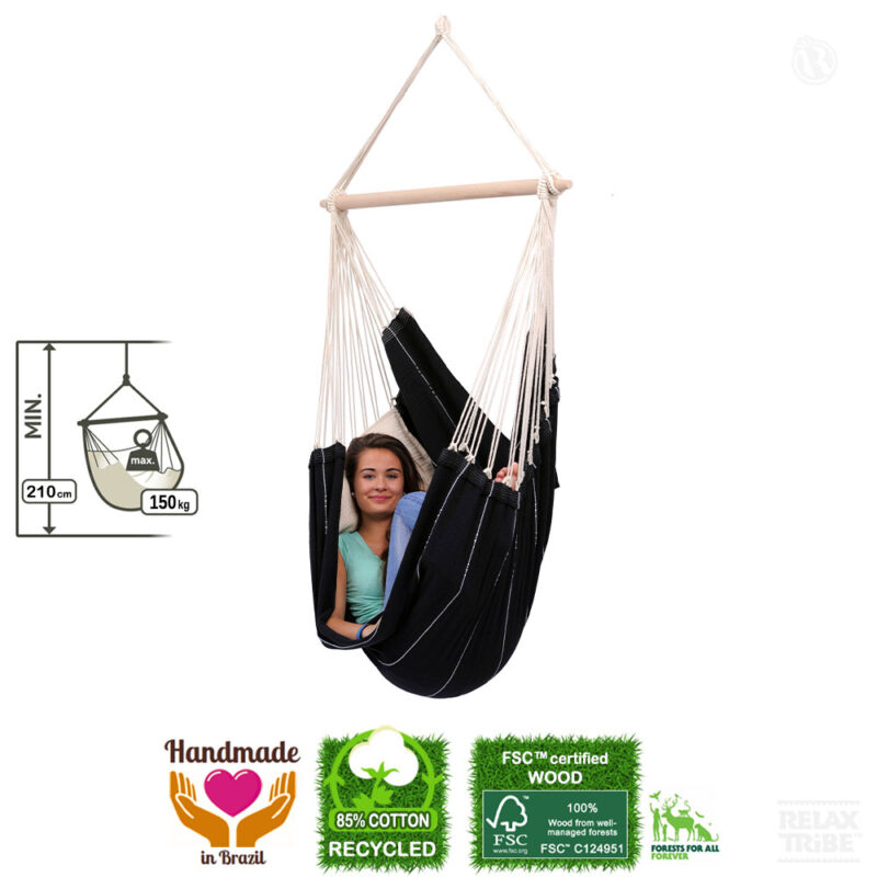 Brasil Black: Silla Hamaca XL [1-2p] Algodón Reciclado+Madera FSC /Hecha a Mano