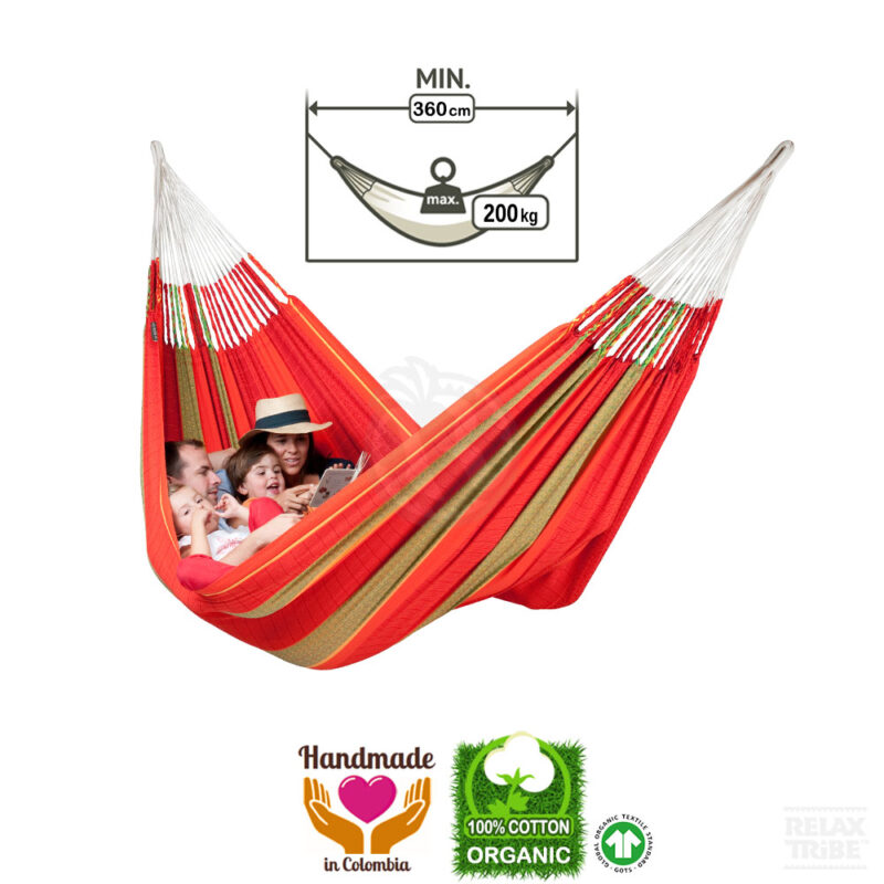 ![Flora Chilli: Eco-Hamaca XXL [2-3p] 100%Algodón Bio /Hecha a Mano - Imagen 5](https://relaxtribe.es/wp-content/uploads/flora-chilli-family-xxl-eco-hammock-pure-organic-cotton-handmade-red-orange-green-patterns-textile-detail-500x500.jpg)