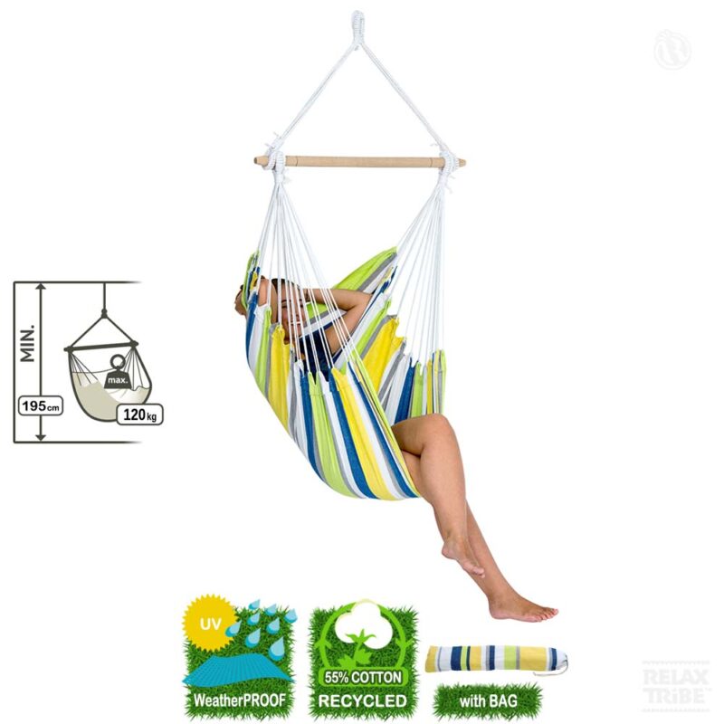Disfrute de una experiencia de relajación única con la silla colgante ‘Relax Kolibri’ para uso en exteriores o interiores, con una encantadora mezcla de colores vibrantes y una tela suave pero muy resistente para una durabilidad reforzada.
