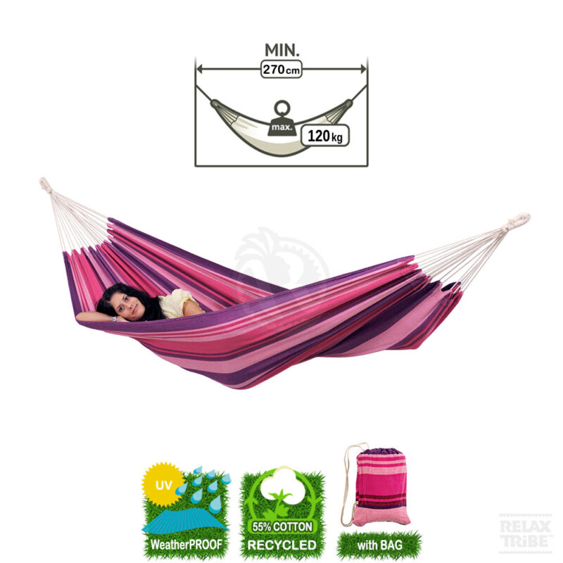 Fabricada con una mezcla única de fibras especialmente desarrolladas para hamacas, con algodón reciclado, esta hamaca individual ha sido diseñada para resistir diferentes condiciones climáticas y los rayos UV. El material es excepcionalmente resistente y duradero, asegurando que las rayas vibrantes en rosa, malva, rosa oscuro y morado se mantengan vivas y hermosas a lo largo de los años.