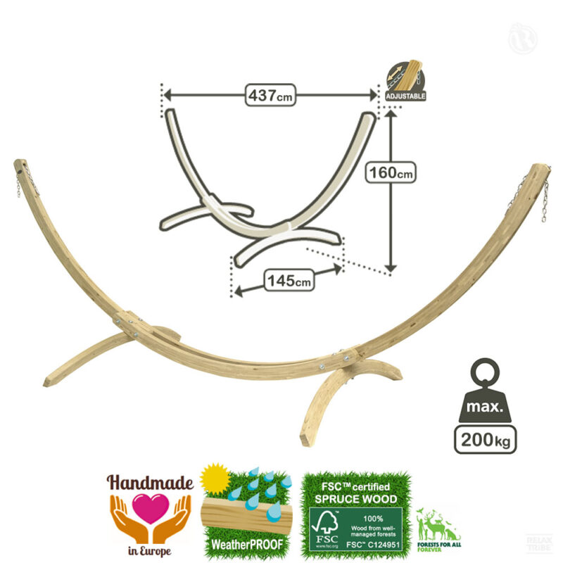 Soporte XXL [máx.200kg] Hecho a Mano de Madera de Pino-Abeto FSC™certificada y Resistente al Clima [Casa y Jardín] c/ Suspensión Ajustable p/ Hamaca Doble o Kingsize c/ longitud total 340-420cm